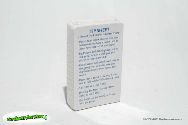 This item is a opened box, but UNUSED, Shoot the Moon Card Game from Fundex 2007. The cards and chips are still in their factory sealed plastic. The box has light shelf wear on some corners, and a small tear on the front upper left corner. The Cards look nice as do the chips and instructions.