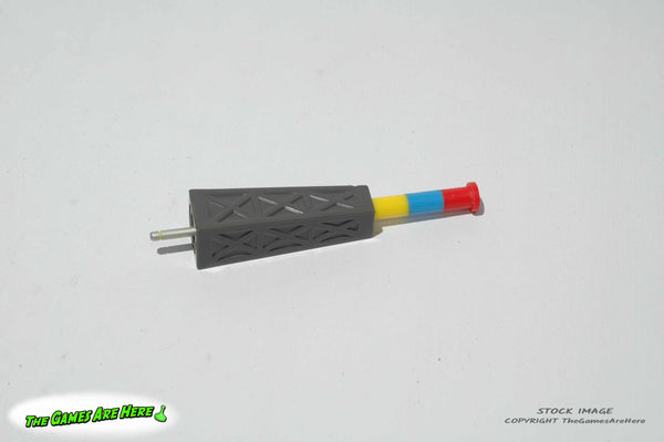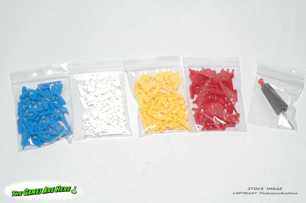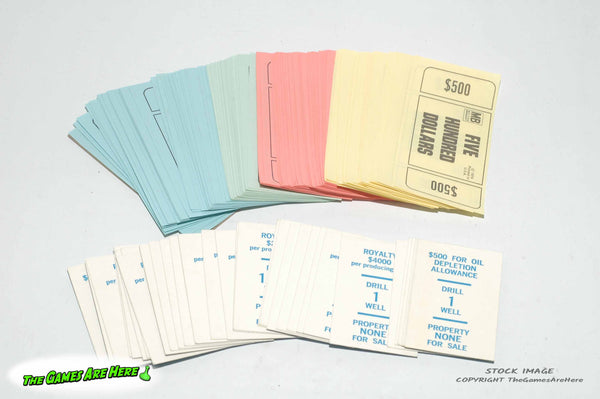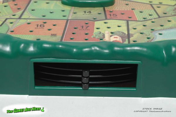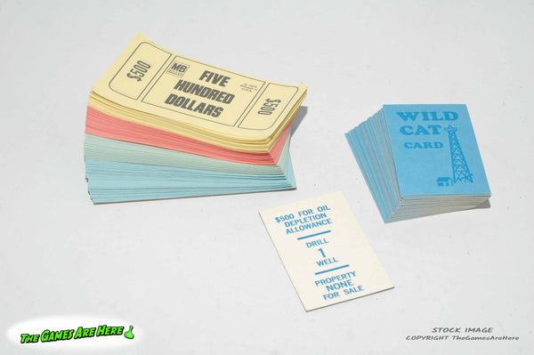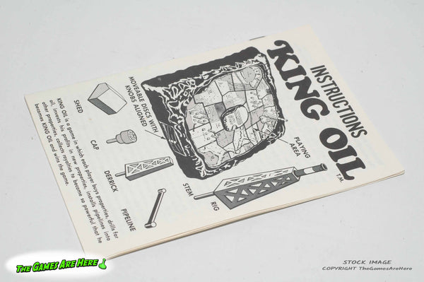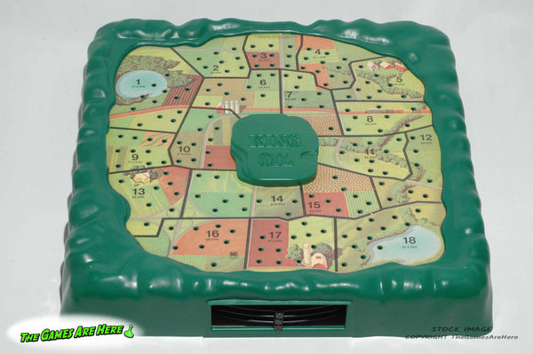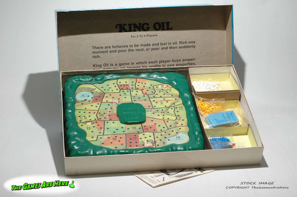 This item is a USED King Oil Game from Milton Bradley 1974. It is COMPLETE. The box has some shelf wear on the corners\edges, and face, all box corners are intact with no tears or tape. The box back is nice and clean, this game does not have the ding/tear near the corner. It also does not have the remnants of the store sticker on the front upper right corner, but it has more shelf wear on the lower point area of the picture of the board and near the lower right corner area. There is a tear in the cover paper on the front upper edge just above the "G" in "KING" that reveals the cardboard below (approx. 1 inch long). The board looks and works good, all three dials work great. Each set of pieces have been inventoried to be complete (as all our games are) and each consists of: 32 Caps, 21 Derricks, 9 Pipes and 6 Sheds. The instructions look good and lay flat. The Cards and play money look good and lay fairly flat. The back of the unit is the style that has the little metal pins holding the plastic pegs and they are all intact (as in our stock photo). Overall it looks good.