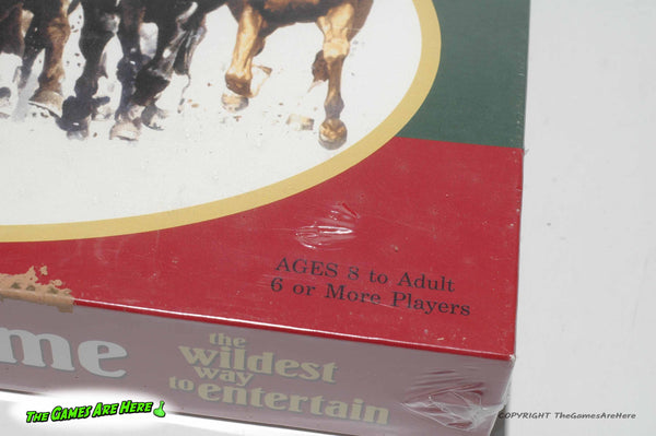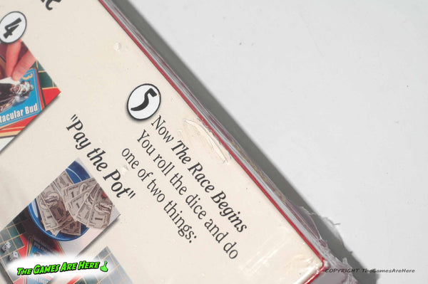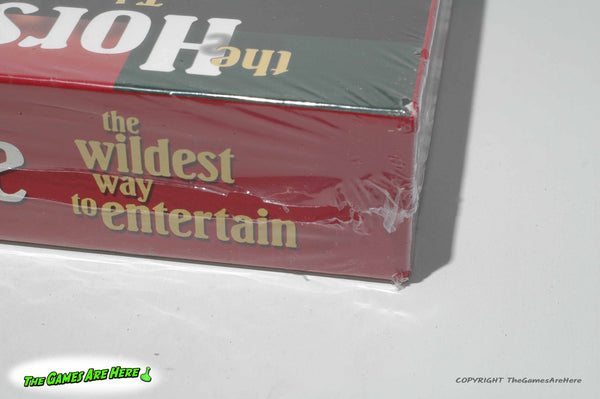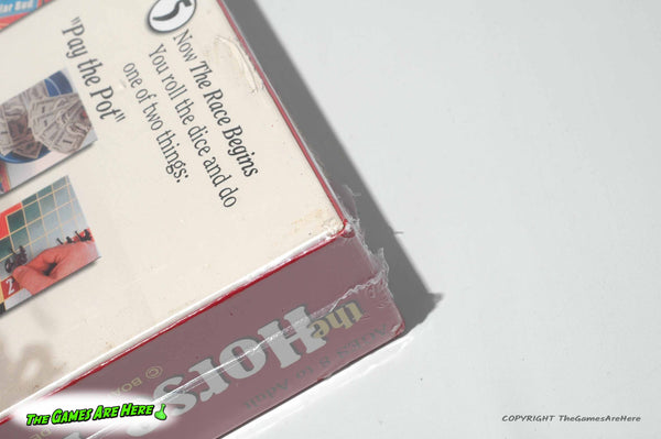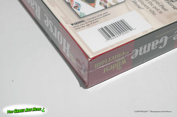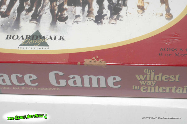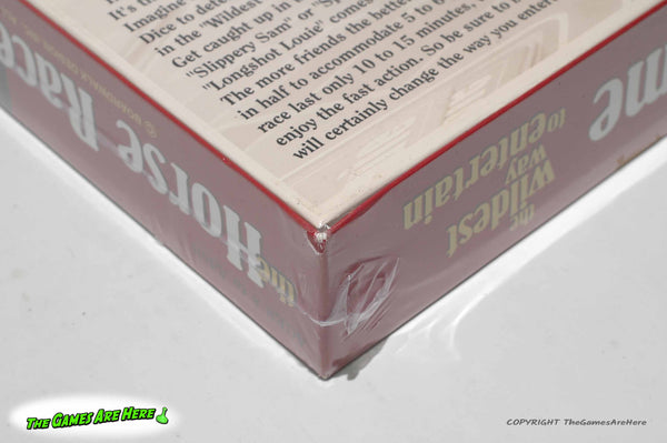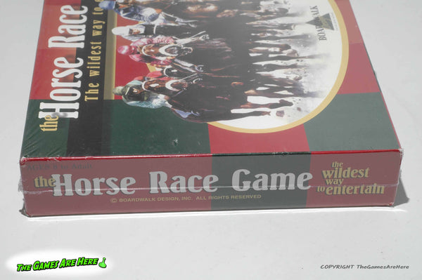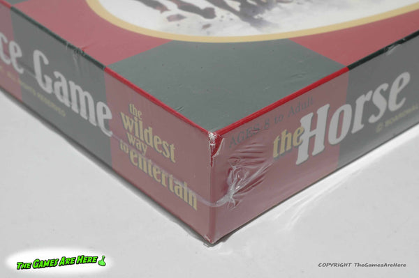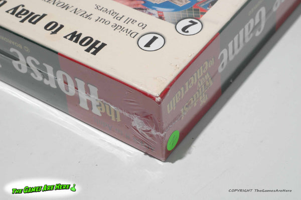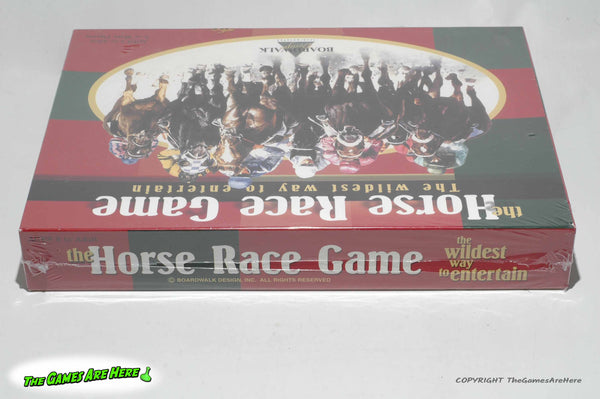 This item is a Factory Sealed The Horse Racing Game from Boardwalk Design Inc (no visible date). The corners of the box are protruding through the shrink wrap and they show white paper below from rubbing. There are remnants of a sticker on the front lower edge near the right corner. There is a ding on the back upper edge near the right corner, it tore the plastic and dented the box. The seam in the plastic along the upper side edge of the box is splitting. The counts of the cards/dice and horses are unknown as the box back does not state their numbers.