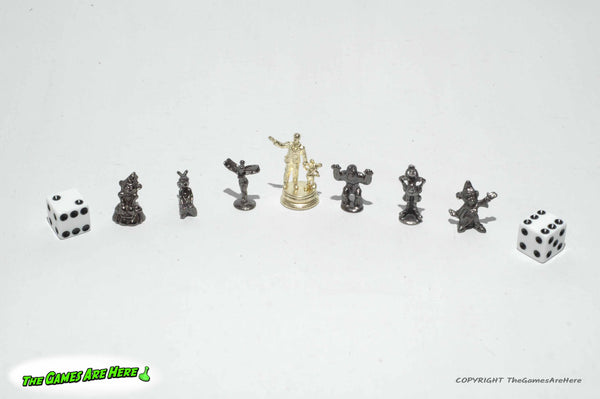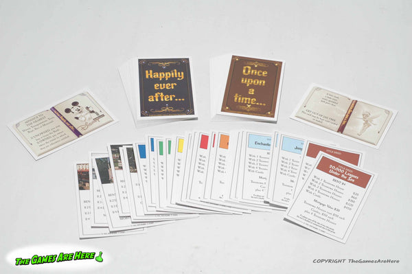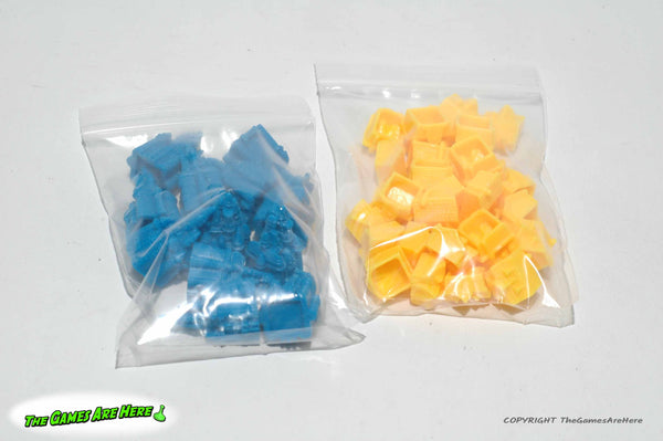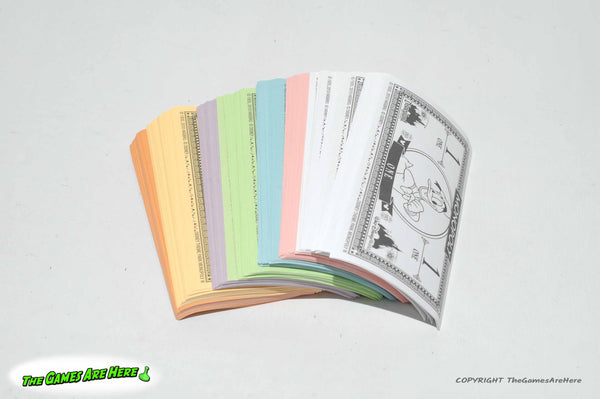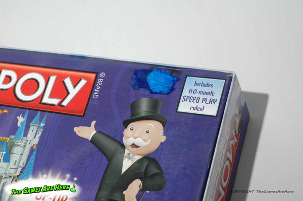 The box has shelf wear on the corners\edges, all box corners are intact with no tears or tape. There is a piece of clear box tape on the back running vertically for 3/4 of the box and the cover has bubbling from where the rest of the tape was removed. There is a worn area on the upper right corner area that has some blue marker markings on it. The board has the pop up castle intact and it looks good. The play money is bowed from being left in the plastic liner slots for the money and the lid was put on it which crushed/rounded the bills. The cards and Deeds look nice and lay flat. We added two extra color coordinated dice, just for fun.