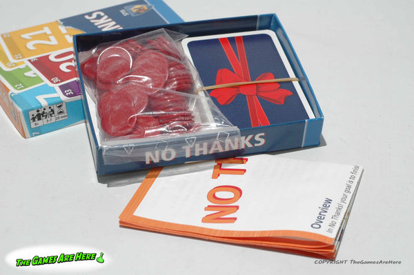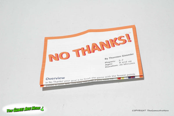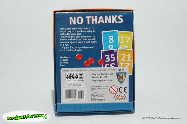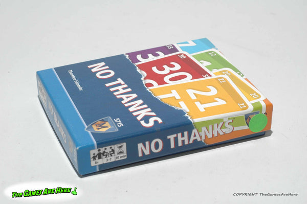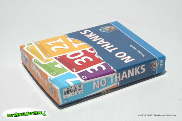 This item is a USED No Thanks from Mayfair 2015. The box has a little shelf wear on the corners\edges, all box corners are intact with no tears or tape. Two of the Cards have a slight bend near one end, but they look good and the rest of the deck lays nice and flat, overall it looks good.