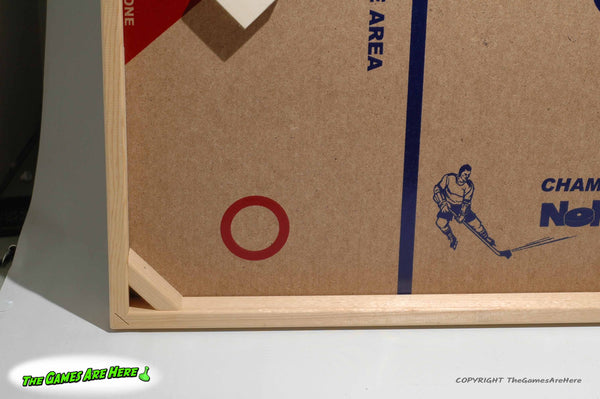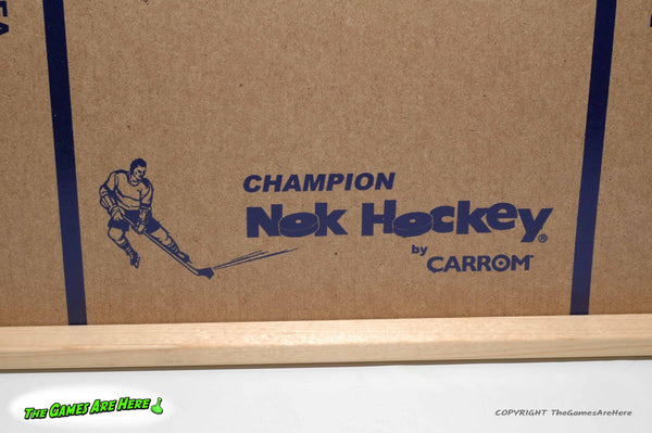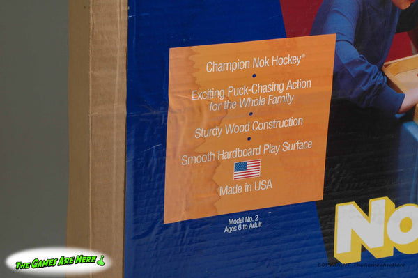 This item is a opened box, but UNUSED Nok Hockey from Carrom Vintage (no visible date). There is a sticker on the box that has the date 9-29-01. This box was still factory sealed, but we opened it to inspect the contents due to the stain on the front of the box.