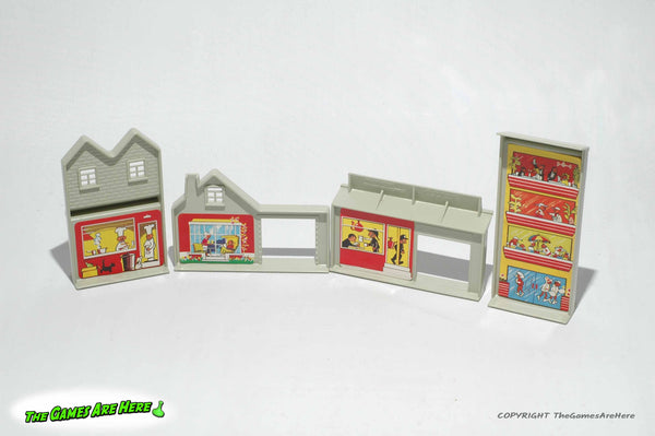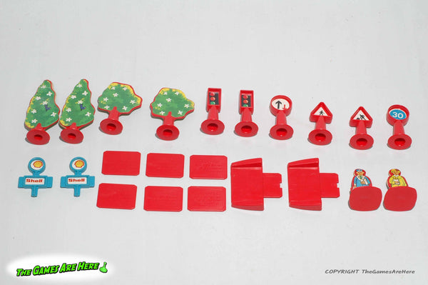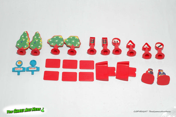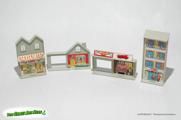 This item is a USED Matchbox Play Track PL-2 from Lesney Products 1981. The box has shelf wear on the corners\edges\faces, there is wear and remnants of store stickers on the front upper right corner area. There are stains on the front of the box. The top flaps and handle shows wear, but it is intact. The stickers on the trees have some wear, one round "Shell" sticker on one side of the gas station inserts is missing, the other three are still attached. All road signs and people have both sides of their stickers. The plastic road, curves and pieces are intact and in good condition. The buildings have all their stickers, some have some wear, but look good. There are four extra pieces that are not listed on the inventory picture on the side of the box (last picture).