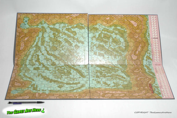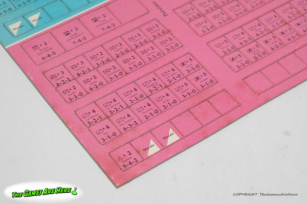 The box has shelf wear on the corners\edges, and there is a tear in the cover paper on the front upper right corner area. Two lid and one box bottom corner are split\taped with clear box tape. There are light creases running along the front upper edge. One of the long edges on the back in indented with a crease and there is some fading on the back cover paper. The counter sheet has some discoloring\stains on it at the upper right and lower left corner areas. The black tape on the back of the board is showing it's age, but it still holds together decently well.