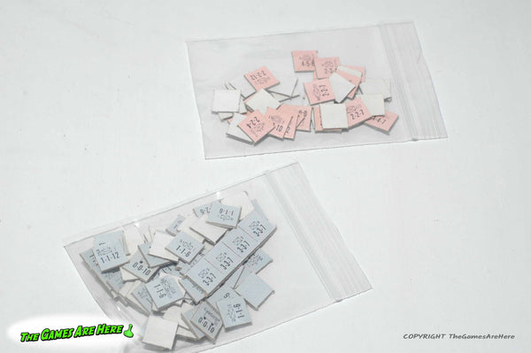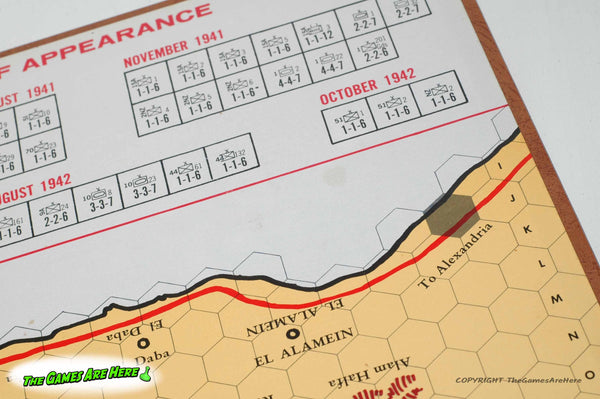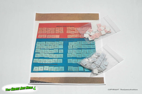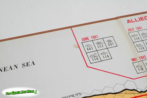 The box has some shelf wear on the corners\edges, and little on the faces. All box corners are intact with no tears or tape. The two part board has a few light stains on one of them. The counters look good, we printed a picture of the original counter sheet (see pic) so we could inventory this game, it is complete. Three of the ten game records on the Time Record card have pencil marks on them. Overall it looks good