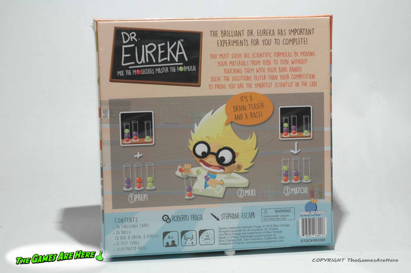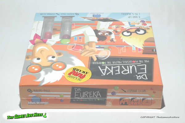 This item is a Factory Sealed Dr. Eureka Game from Blue Orange Games 2016. There is a slight dent on the front right side corners, there are some light nicks in the plastic along with some scuffing, but it looks good.