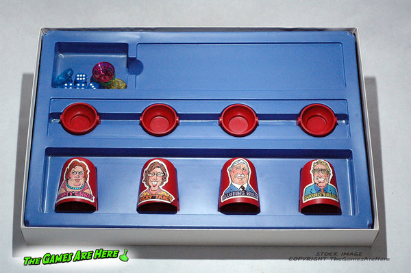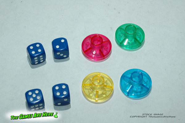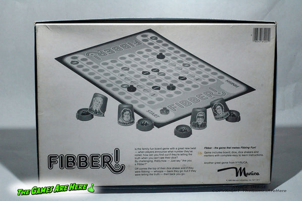 This item is a USED Fibber! Game from Maruca Industries 1986 with Replacement Dice. The dice are blue and are translucent, not opaque as the original blue dice were. The box has shelf wear on the corners\edges, and faces. One lid corner is split\taped with clear box tape and there are pieces of clear tape on the side edges of the lid that were used to seal it up. There are light stains on the front right area, there are some creases on the front face. The board and other contents look good.