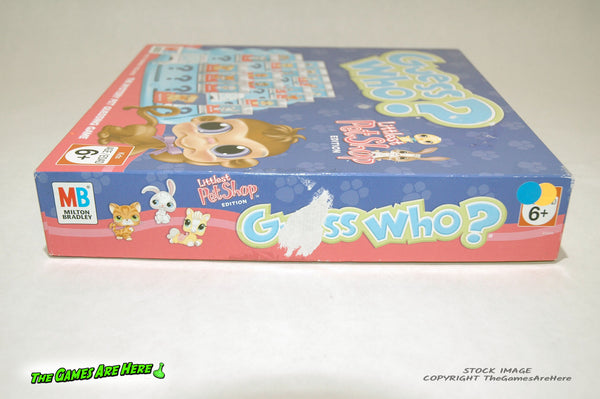 This item is a USED Guess Who? Littlest Pet Shop Edition from Milton Bradley 2007. These versions of Guess Who? tend to have very loose frames and they tend to fall out of the boards rather easily, and this game is no different. In processing it we have adjusted the two posts on the frames to help hold them in place better, but they still tend to fall off the board. The box has some shelf wear on the corners\edges, all box corners are intact with no tears or tape. Some of the green face cards have some tape residue from where someone taped them onto the frames, but they look okay. The Mystery cards look good and lay flat and it has two extra frames as backups. Overall a good looking box with a playable game, but just be aware of the loose doors.