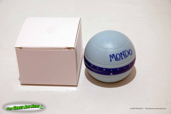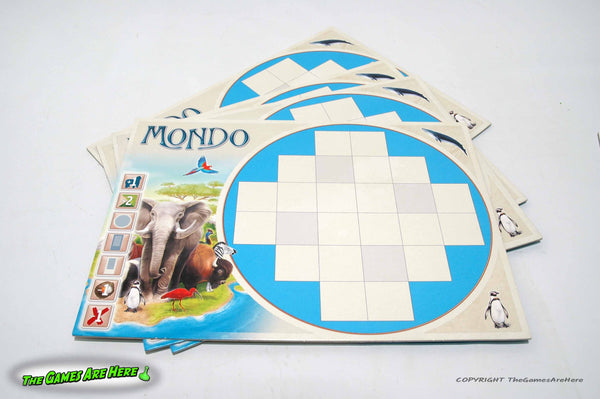 This item is a opened box, but UNUSED Mondo from Pegasus Spiele German Edition 2012. The instructions are only in German, no English rules are included. We do see that BGG has a English set of instructions. The box has shelf wear on the corners\edges, all box corners are intact with no tears or tape. There is a ding on the front left edge and the front lower left corner is a little dented. The contents look nice, all the tokens are unpunched on their sheets. The score pad looks full.