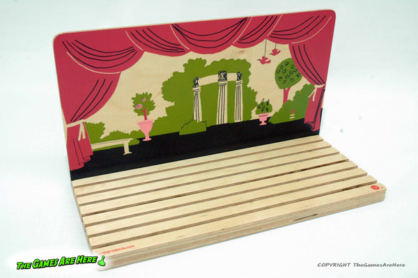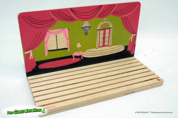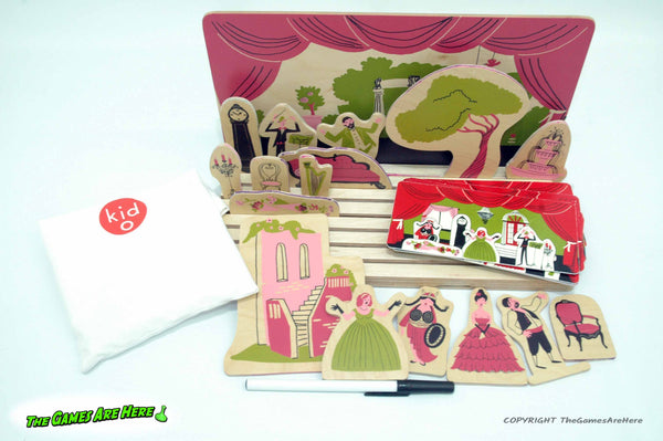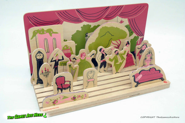 The box has shelf wear on the corners\edges, all box corners are intact with no tears or tape. There are some creases on the side edges of the box lid. The board and other contents look good and overall it looks good. The box states it as a "Play Theater and Game", but the back of the box states the game as recreating the pictures on the cards with the wooden pieces. It is not really a game, this item does not have instructions inside the box. The back also states it has 24 cards, but research shows it is 12 two sided cards, which this has.