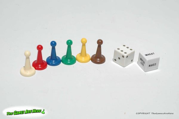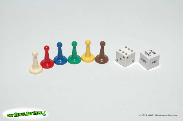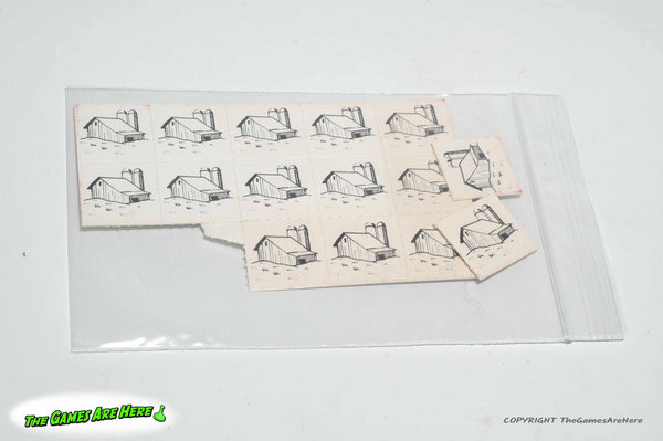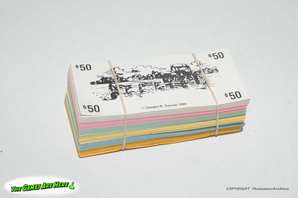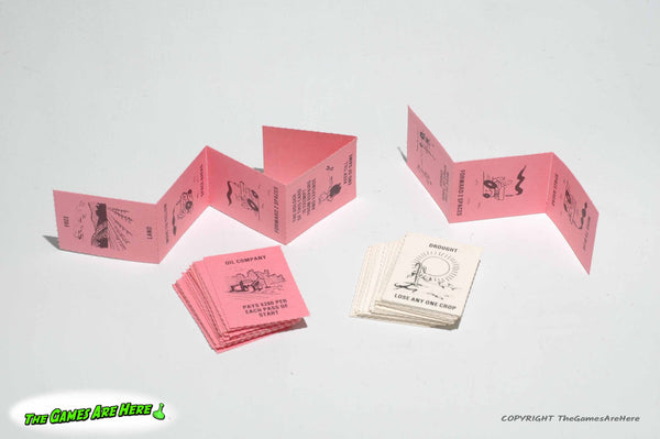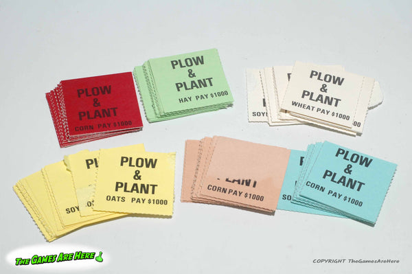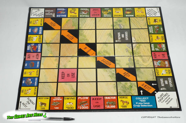 The box has shelf wear on the corners\edges, and back face. One lid corner is split\taped with clear box tape and the splitting runs along the lower edge inward from the lower left corner approx. 4" long which is also taped. The lower edge of the box is rounded on the left area. The board looks good, a number of the square cards have peeling from when they were taken off of their perforated sheets. The small white farm cards have 13 still on it's perforated sheet and two are loose. 8 of the 35 pink cards are still connected together in two sections (3 and 5). The play money looks nice and lay flat, the score pad is very close to full.