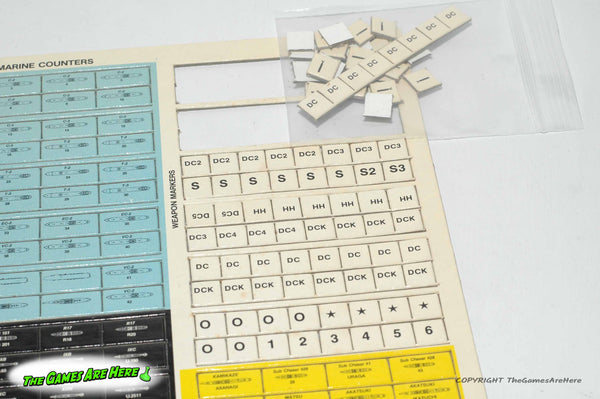This item is a opened box, but UNUSED Submarine from Avalon Hill 1977. The counter sheet has 32 counters punched out, 282 counters are still unpunched on the sheet.