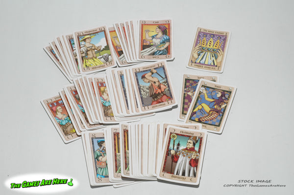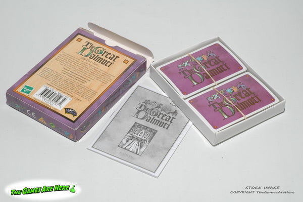 This item is a USED The Great Dalmuti Card Game from Wizards of the Coast 1995. The box has light shelf wear on the corners\edges, the box liner looks fine. Both decks of cards look nice and lay flat, they do not have the slight bow in them shown in our stock photos. The instructions look good and lay flat.