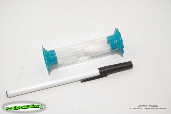 The box has shelf wear on the corners\edges and face, there is a worn area on the front upper left that reveals the cardboard below. All box corners are intact with no tears or tape. The cards look good and lay flat, the other contents look good. We realized after taking the pictures that the instructions call for the sand timer to be 1 minute long. The original timer only runs to :45 seconds so we added a one minute timer and included a stock photo of that timer.