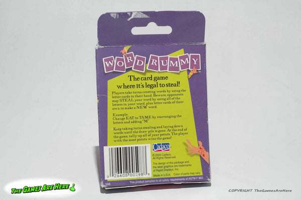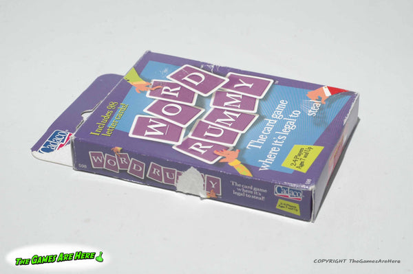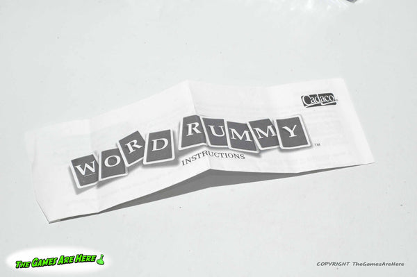 This item is a opened box, but UNUSED Word Rummy Card Game from Cadaco 2004. The box has shelf wear on the corners\edges\faces, there is some tearing on the front upper left edge of the flap that reveals the white paper below. There is a small amount of tearing in the cover paper on the left edge that reveals the white paper there. The Cards look very nice, the instructions look fine.